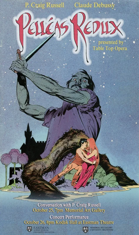 Pelléas Redux recaptures the shocking aspects of Pelléas et Mélisande. It takes Maeterlinck’s avant-garde ideas a step further by substituting traditional operatic sets with P. Craig Russell’s comic book version of the story and by replacing the singers and symphony orchestra with a contemporary ensemble comprised of classical, jazz, and electronic musicians. Russell’s illustrations are given in their entirety and, using various cinematic techniques, are presented in the form of a motion comic. Debussy’s original score is trimmed down to under two hours, the standard time frame for concert performances and is rescored for a chamber ensemble: violin, alto sax, trumpet, cello double bass, electric guitar, keyboards, and percussion. The performance will feature Charles Castleman (violin), Griffin Campbell (alto sax), Clay Jenkins (trumpet), Albert Kim (keyboard), Ken Lurie (cello), Dariusz Terefenko (piano), Jason Titus (electric guitar), James VanDemark (bass), Christopher Winders and Matthew Brown (sound and projections).